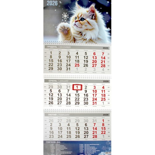 Календар кварт. настін.  Кіт зі сніжинкою 2026 ,3 пружини