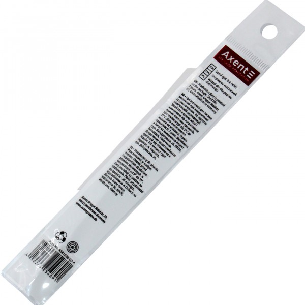 Заміна стержня дозволяє продовжити життя улюбленій ручці і заощадити, коли є необхідність писати багато. Масляні стержні поєднують переваги кулькових і гелевих стержнів: 1) чорнило миттєво висихає, не розмазується, 2) помірна витрата чорнила, 3) м'яке письмо, не вимагає тиску на папір. Крім того, масляні стержні здатні писати при низьких температурах, до-20С. Легке, гладке і акуратне письмо забезпечують високоточний швейцарський пишучий вузол і високоякісне чорнило. Високоточний швейцарський пишучий вузол забезпечує максимальне зчеплення з поверхнею паперу і однорідну та безперебійну подачу чорнила. Високоякісне масляне чорнило плавно лягає, залишаючи рівну чітку лінію. Стержень масляний пластиковий Axent ASR1028-A з наконечником голчастого типу призначений для кулькових ручок. Стержень довжиною 107 мм і товщиною пишучого вузла 0.7 мм. Колір чорнила: синій. Довжина написання: 800 м. Підходить до ручок: Stella, Сolibri, Reporter, Polo.