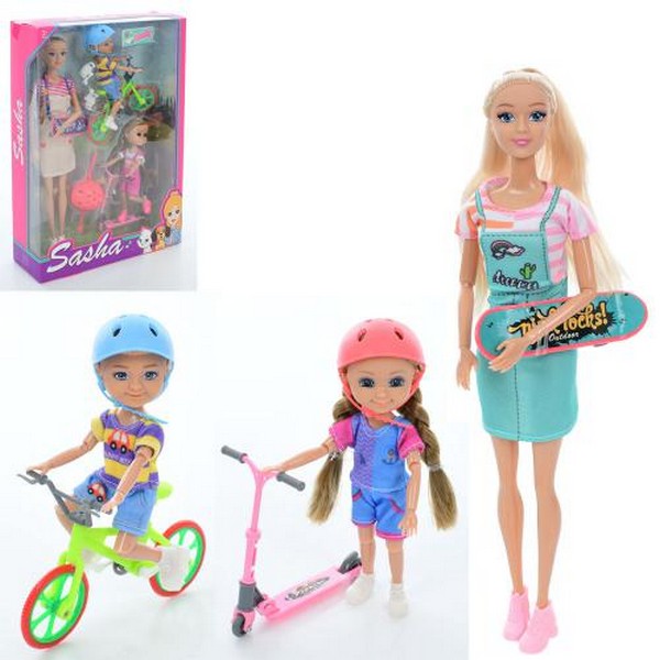 Лялька 30см,на шарнірах,велосипед,2 дітей, самокат,скейт,в кор-ці,23х33х7см 51833(20)
