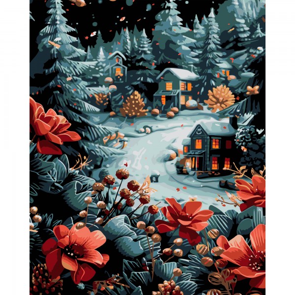 Картини по номерах "Домівки у засніжених ялинках" 40х50см на чорному фоні №AH1242/Strateg/