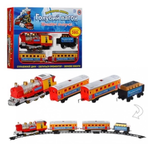 Железная дорога на батарейках, музыкальная, светится голубой вагон, дым, длина пути 380 см, в коробке, 47 х33х7см (12) 7017 / 615