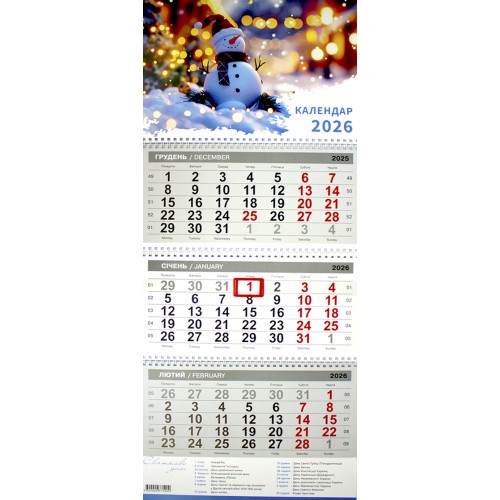 Календар кварт. настін. Сніговик 2026 ,3 пружини