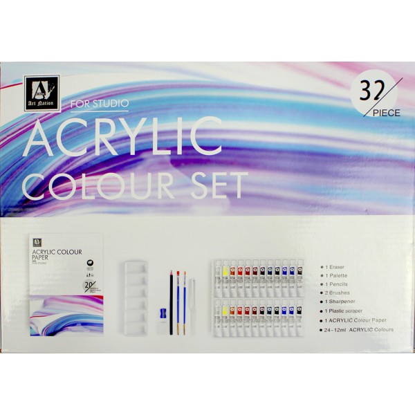Набір аквар. фарб ACRYLIC Art Nation 32шт,24х12мл,1ласт+1паліт+1олівець+2пензлі A32