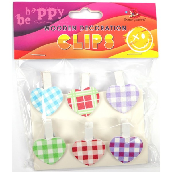 Прищіпки дерев'яні для декорування "Сердечка в клітинку" 6шт, 35х6мм №200185/Мандарин/(1)