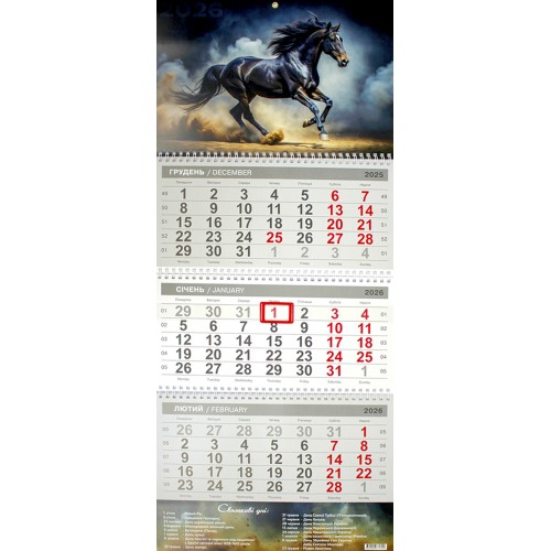 Календар кварт. настін. Чорний кінь 2026 ,3 пружини