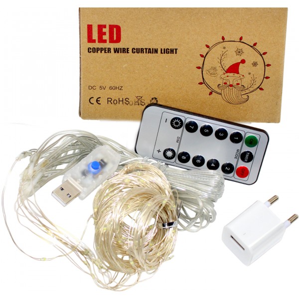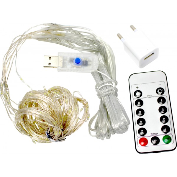 Гірлянда-штора електрич. Роса 200LED USB адаптер,пульт ДК,10ліній білий L-3м H-2м№1938-03u