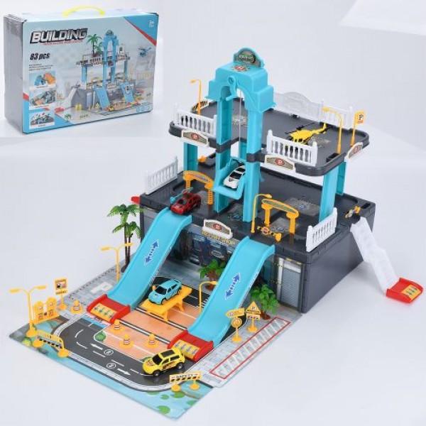 Гараж 2поверхи,ліфт(механічний),машинка 7см 4шт,вертоліт,дорожні знаки,83дет. №A246(9)